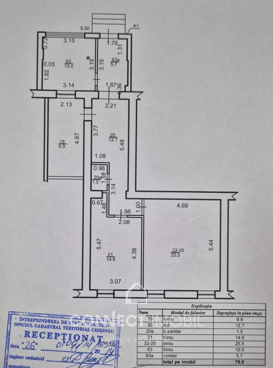 Планировка: Функциональное пространство, разделенное на несколько кабинетов (см. план: кабинеты площадью 9.9 м², 14.6 м², 25.5 м² и 10.0 м²), просторный холл (12.7 м²) и собственный санитарный узел.