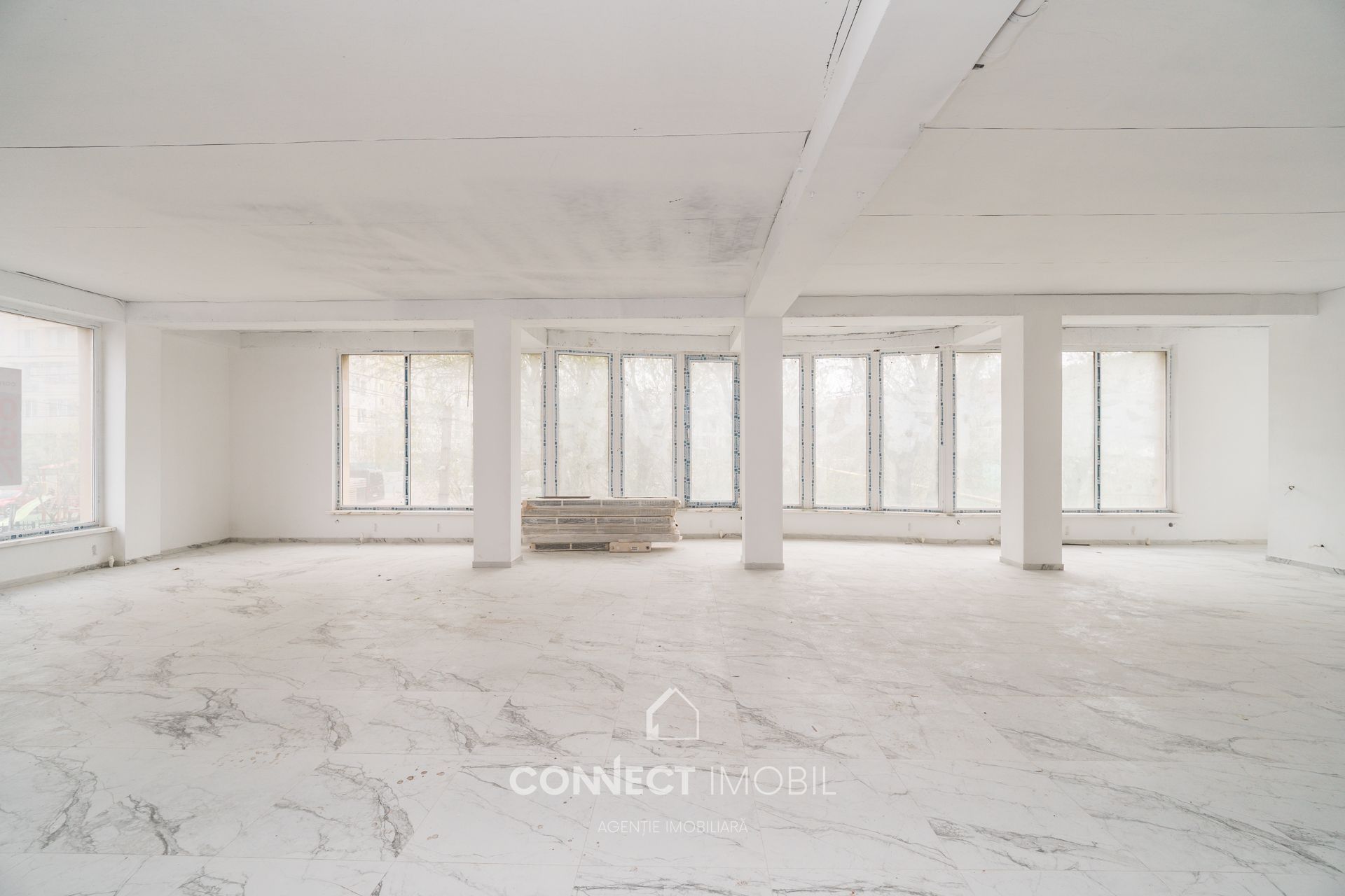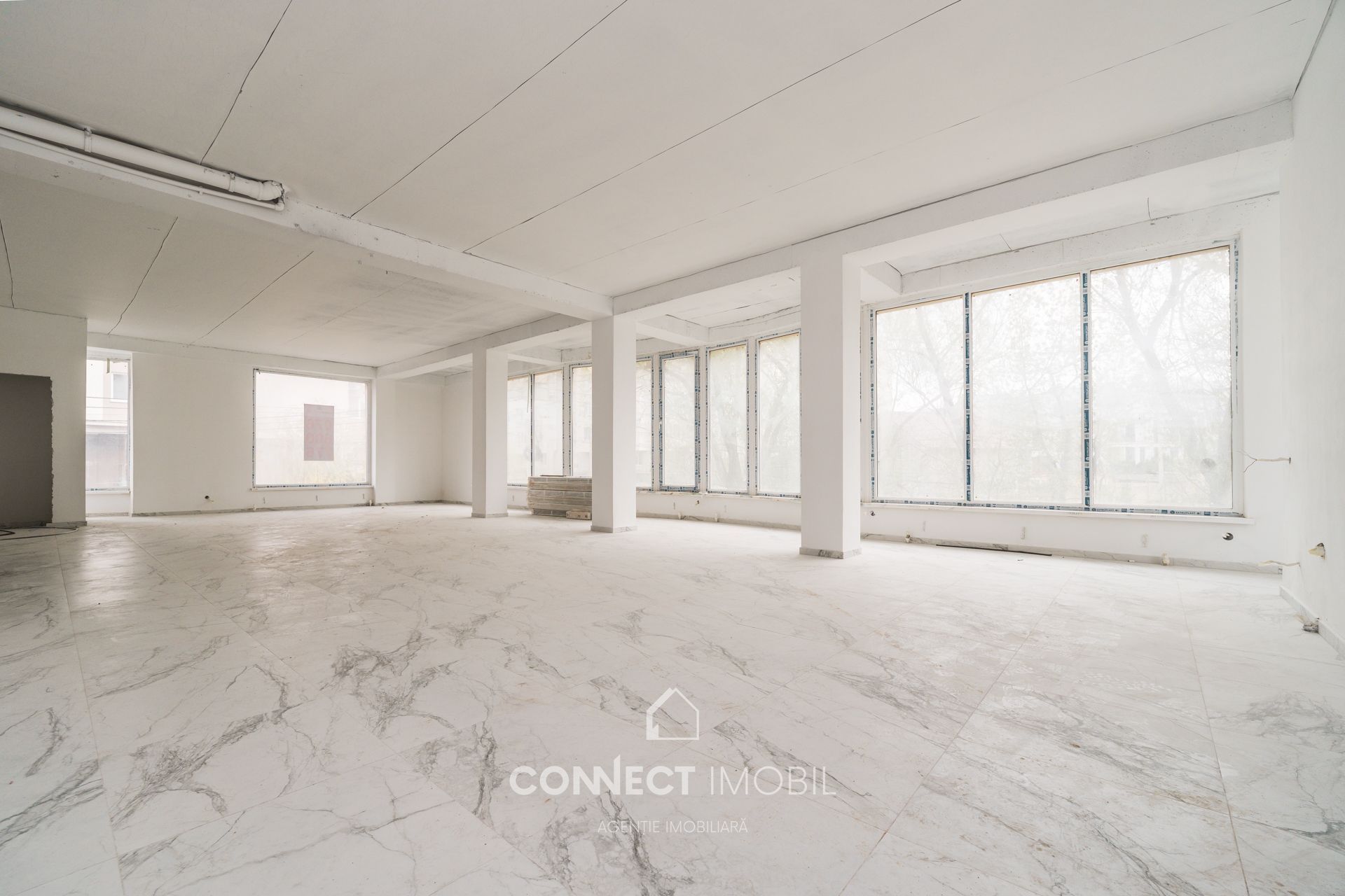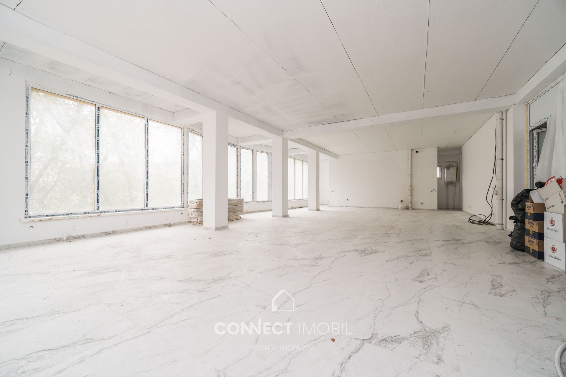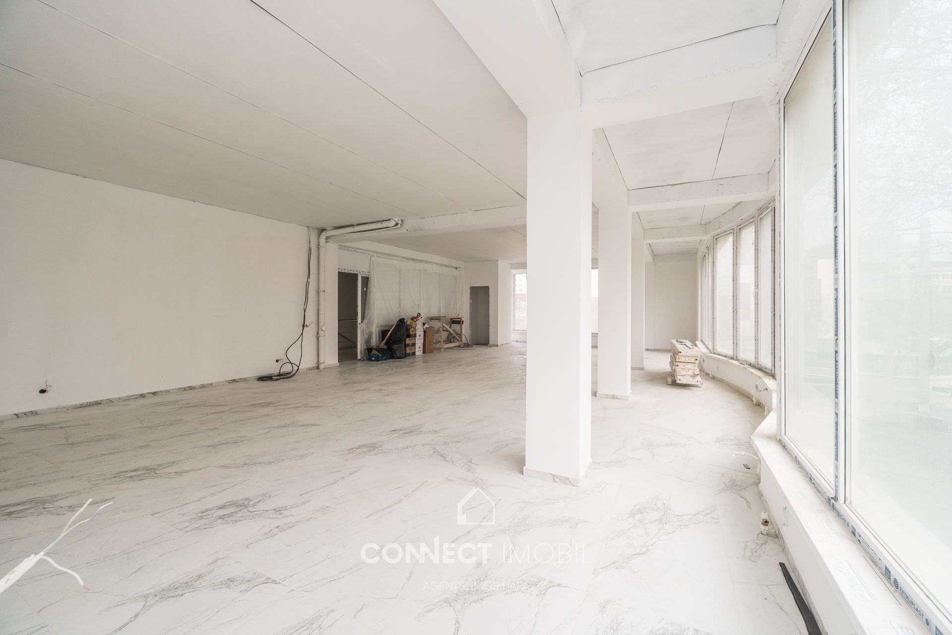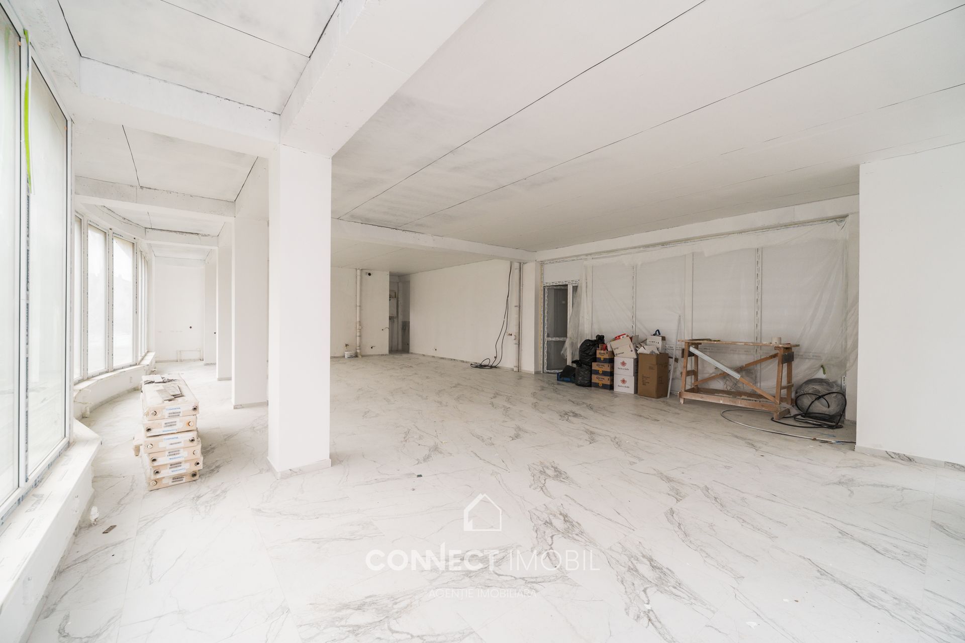 Готовность к финишу: Дорогой пол из керамогранита под мрамор уже уложен, стены в идеальном «белом варианте». Завозите оборудование, расставляйте акценты и открывайтесь!