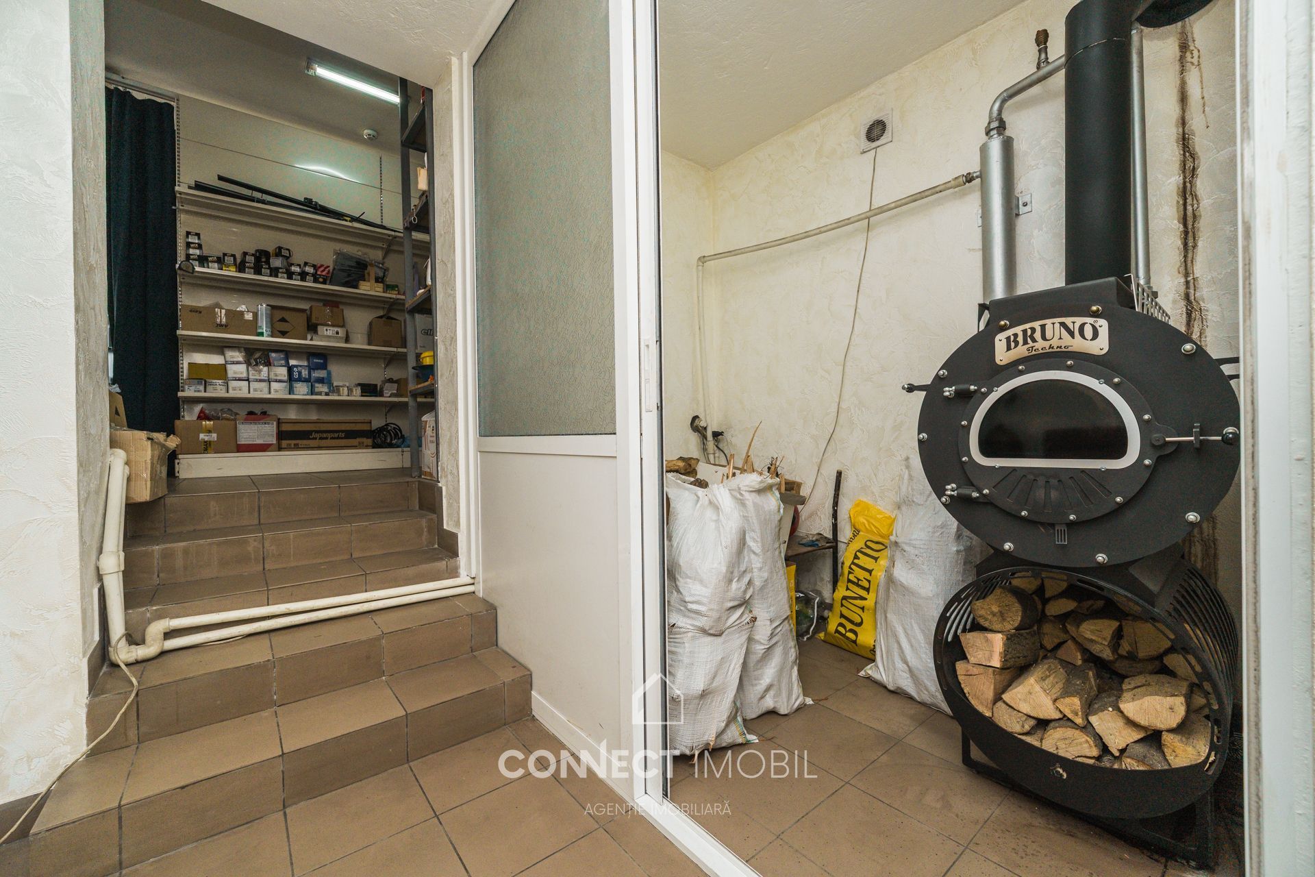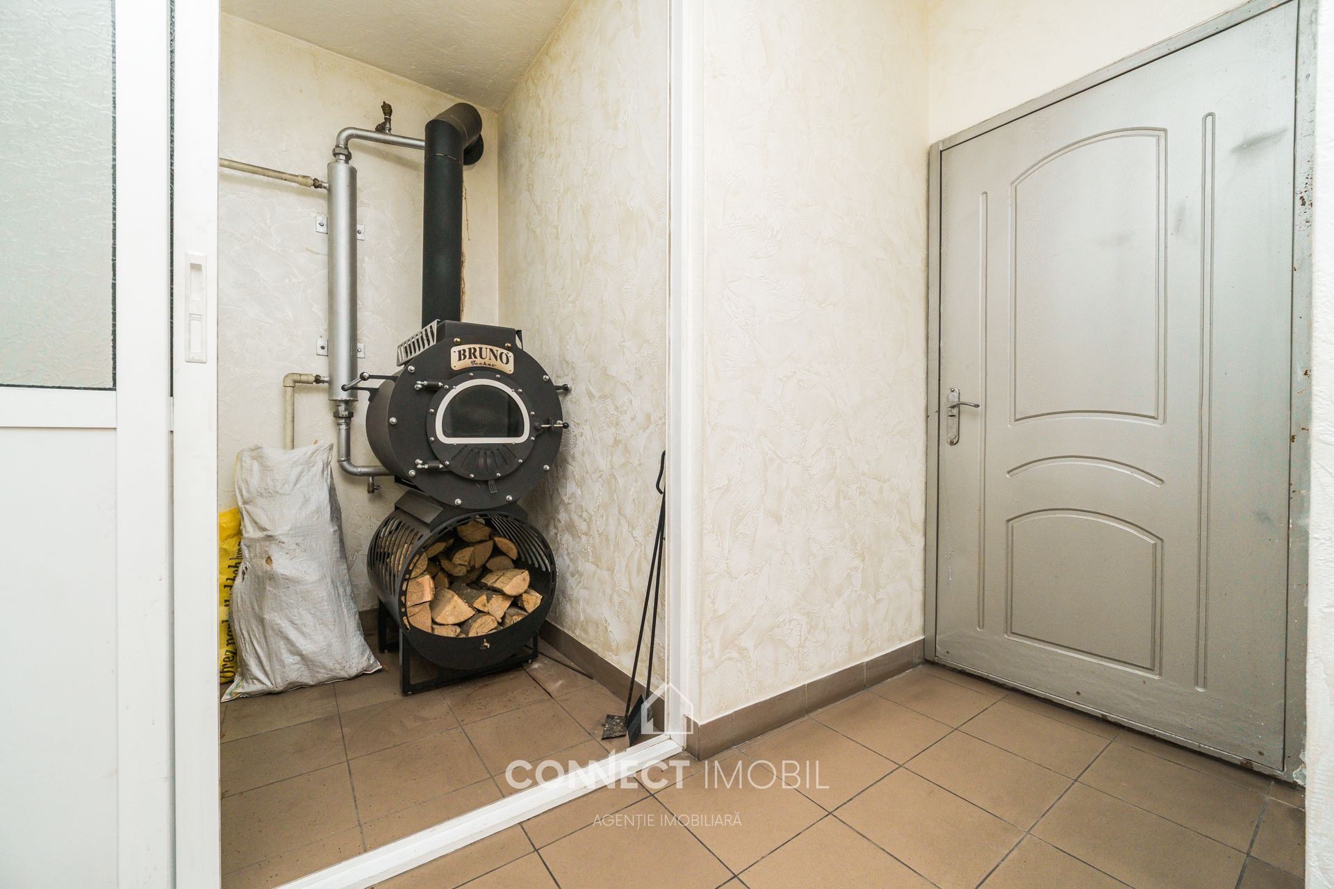 Încălzire autonomă: este instalat un sobă modernă și economică pe lemne Bruno Techno, care asigură confort și costuri de exploatare reduse în perioada de iarnă.