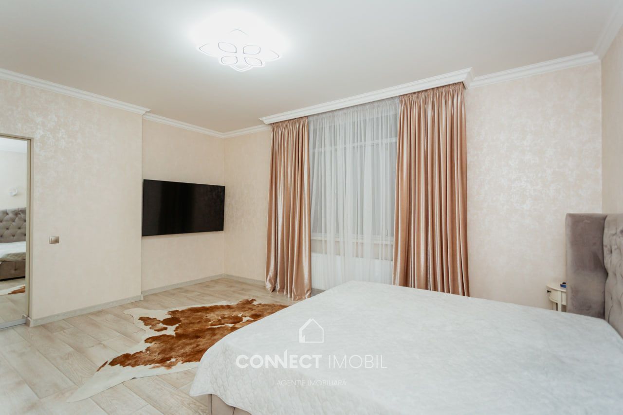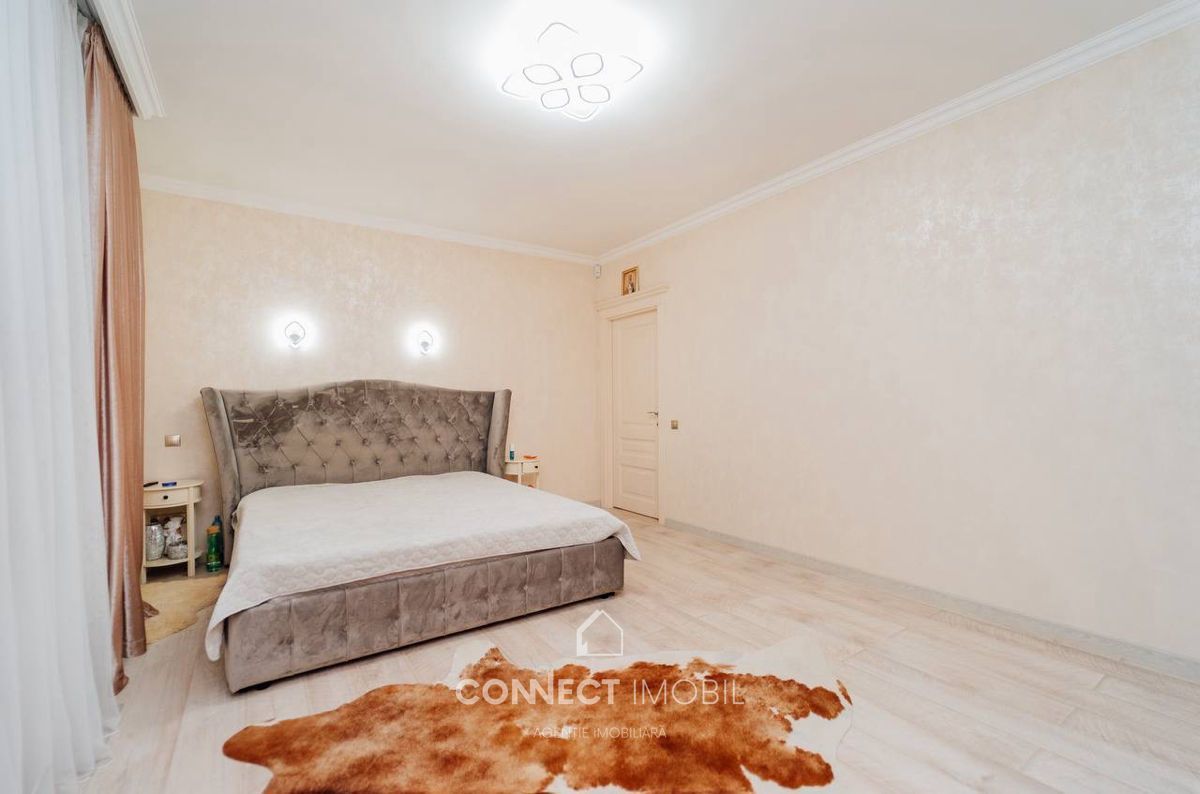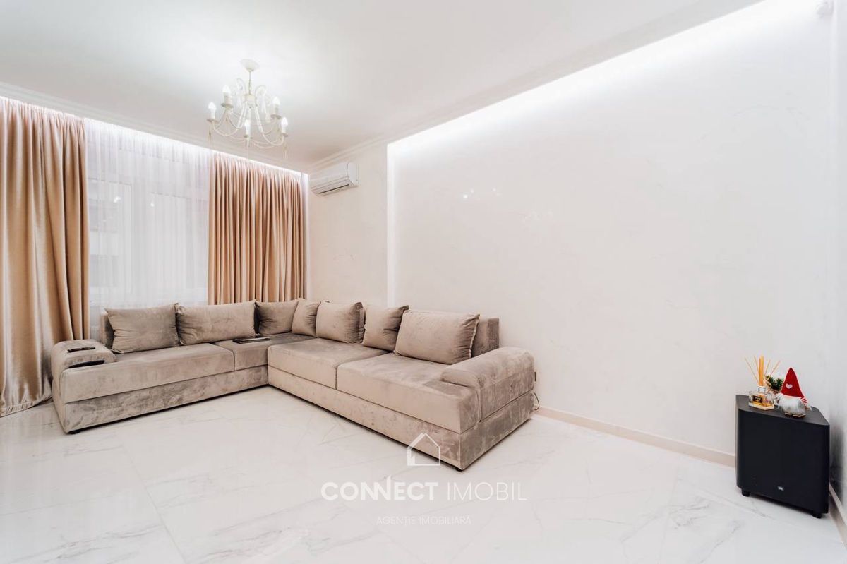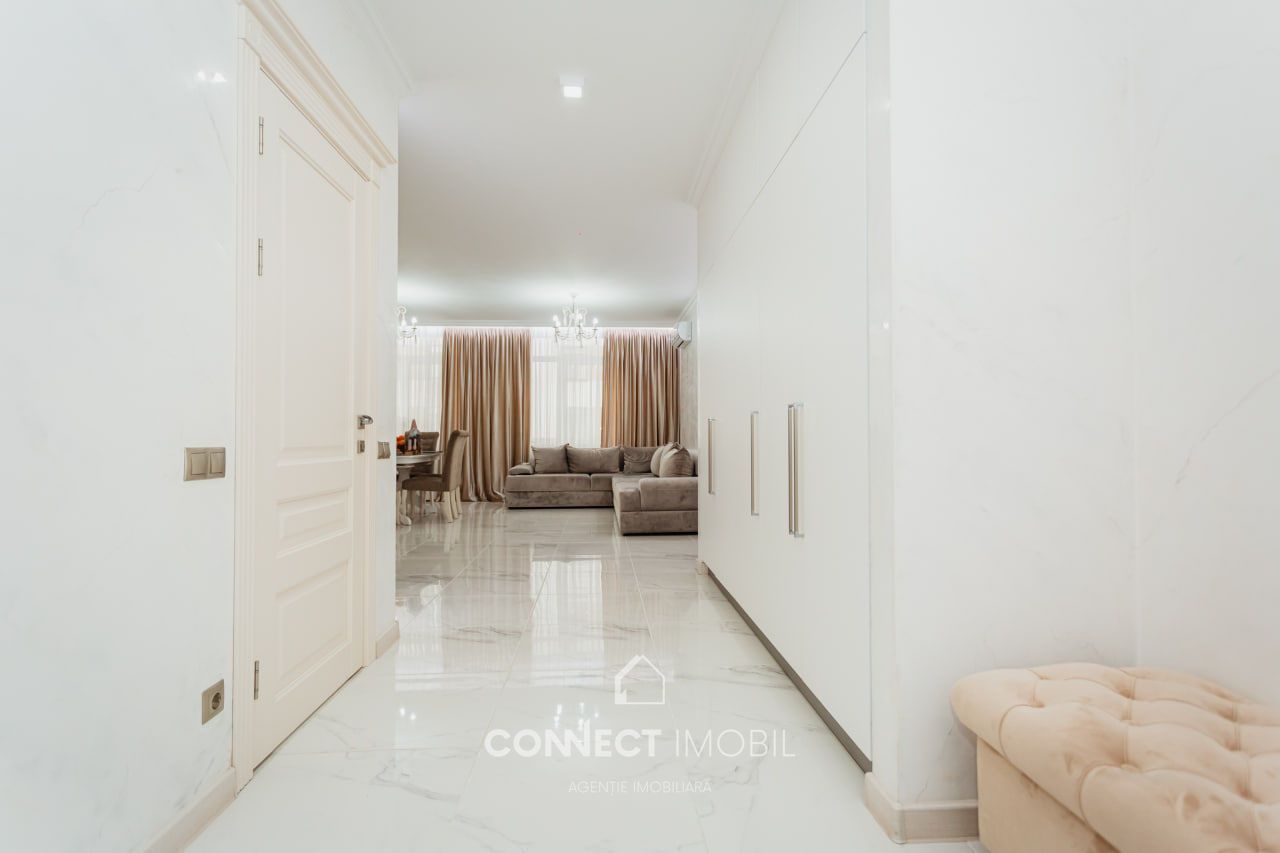 Compartimentat în 2 dormitore, bucătărie cu living spatios, bloc sanitar, dressing room(garderoba) antreu si balcon. Proiect de un design unic, modern, executat cu gust și rafinament din cele mai calitative materiale.