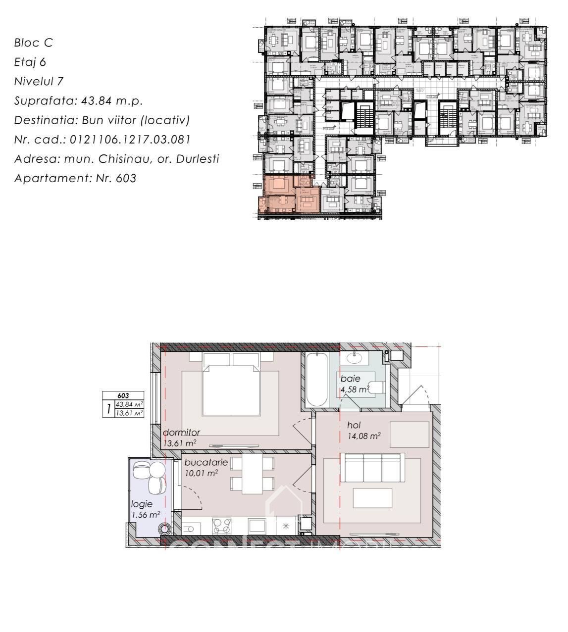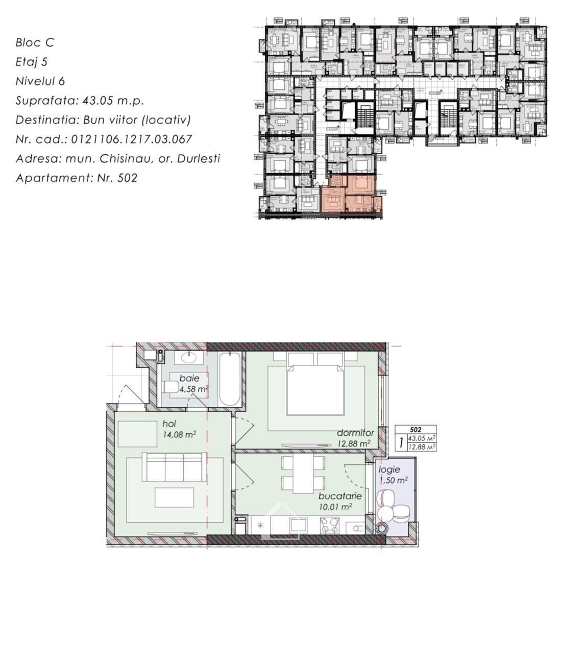 Imobilele sunt situate la etajul 6 din 12, cu o suprafața de 43,05 si 43,84 m2.