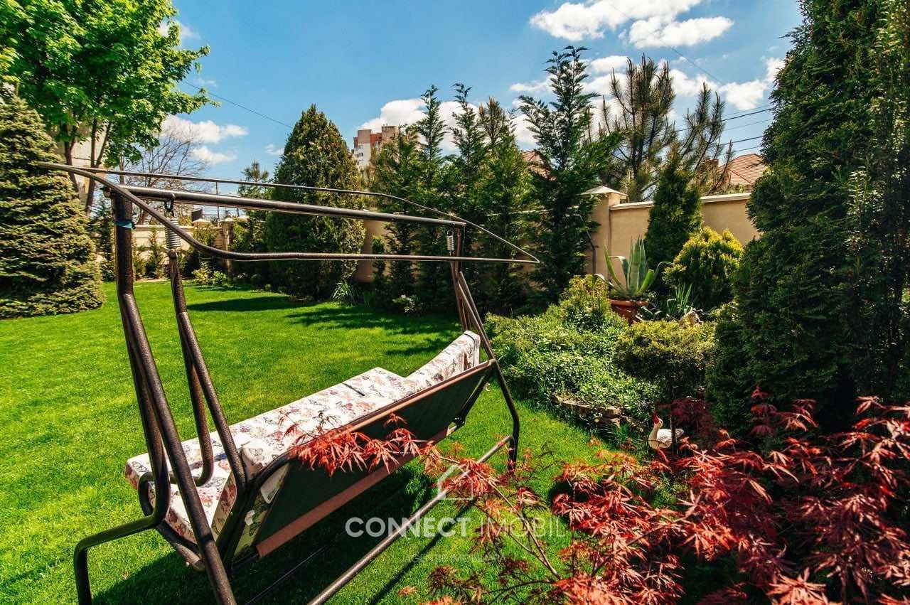 • grădină mare cu design peisagistic și arbori decorativi;
