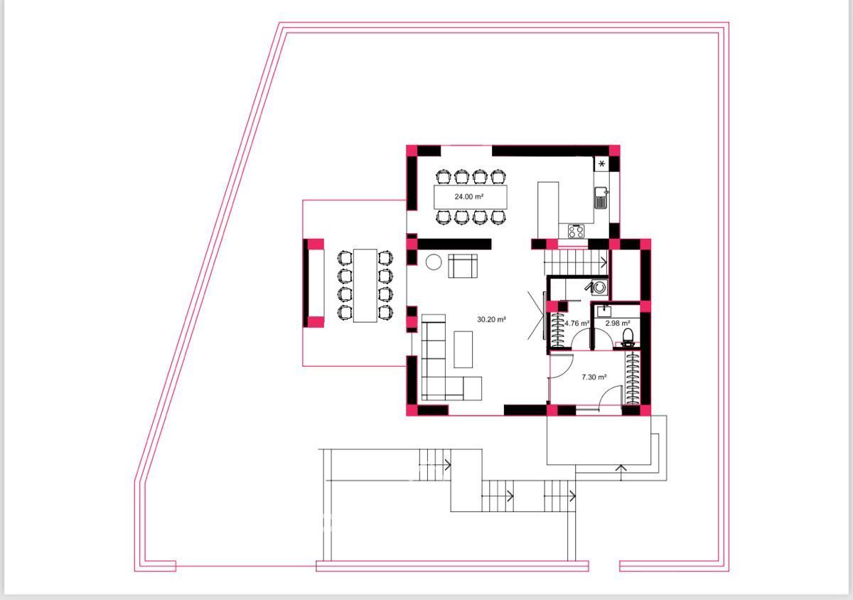 1 nivel - antreu, living, bucătărie, debara, bloc sanitar, terasa