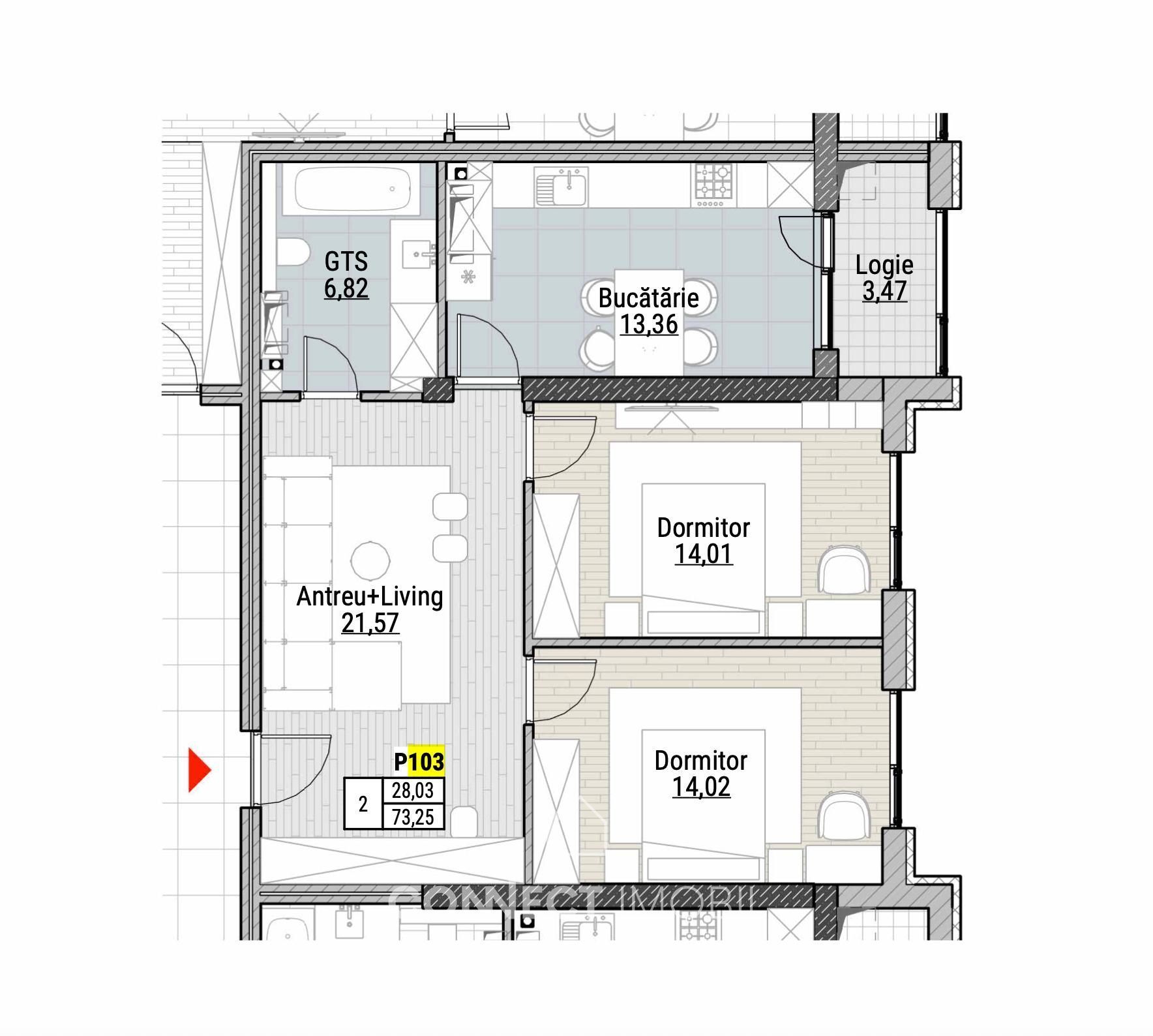 Locuința are suprafața de 72 mp și este compartimentată în: 2 dormitoare, bucatarie, living, antreu, balcon, bloc sanitar.